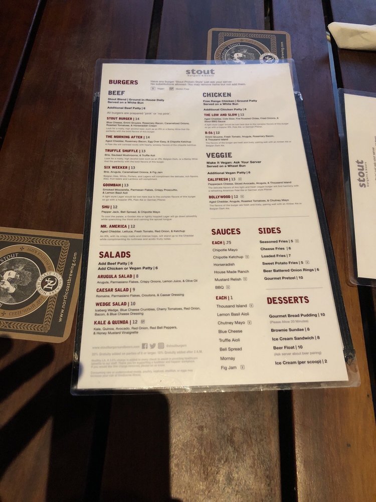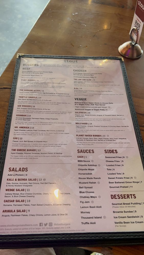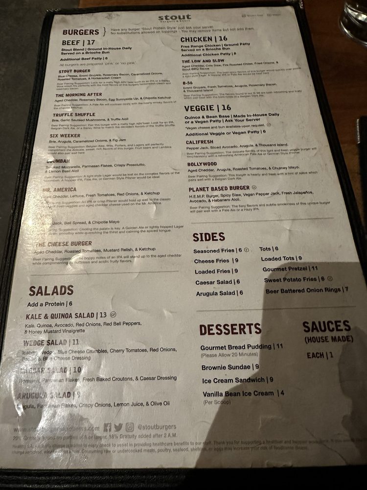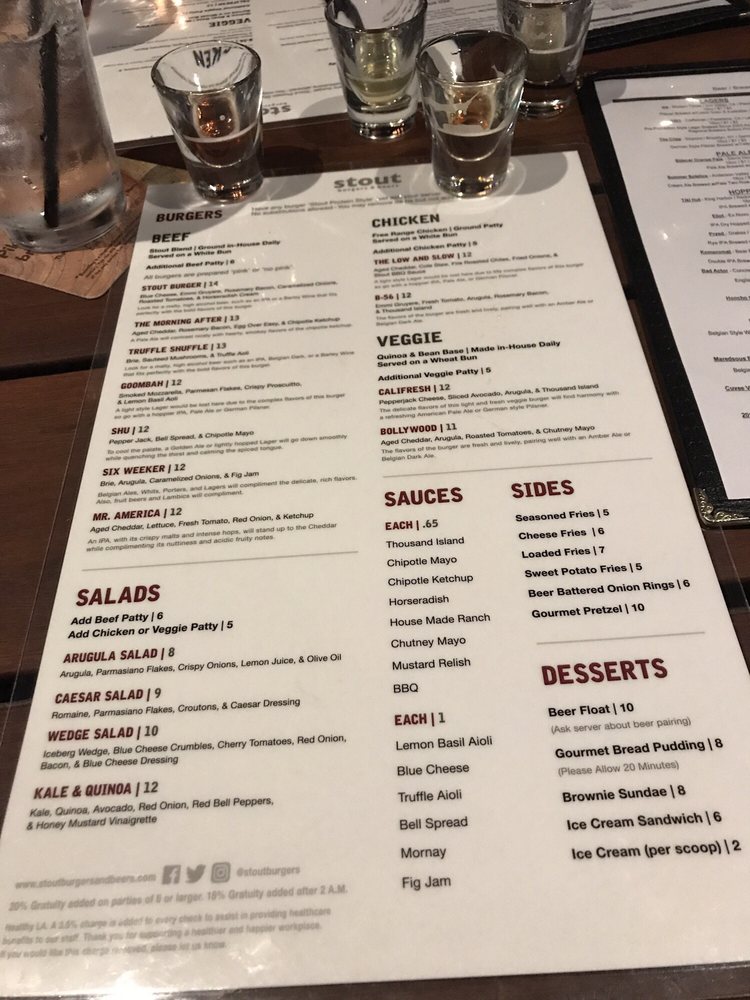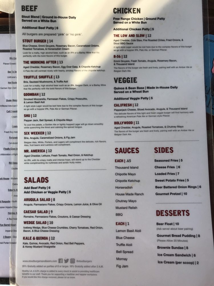 Stout Burgers & Beers, located in Los Angeles, offers a diverse menu with options for beef, chicken, and veggie burgers. Customer reviews rave about the flavorful burgers, like the Truffle Shuffle and the Stout Burger Blue Cheese. The casual and trendy atmosphere makes it a great spot for lunch, dinner, or a late-night bite. The restaurant also provides vegan and vegetarian options, making it inclusive for all diners. Stout Burgers & Beers is known for its attentive staff, great beer selection, and must-try sides like loaded fries and tots. Despite parking challenges, patrons keep returning for the delicious food and welcoming ambiance. Overall, Stout Burgers & Beers stands out for its high-quality burgers and vibrant pub atmosphere.