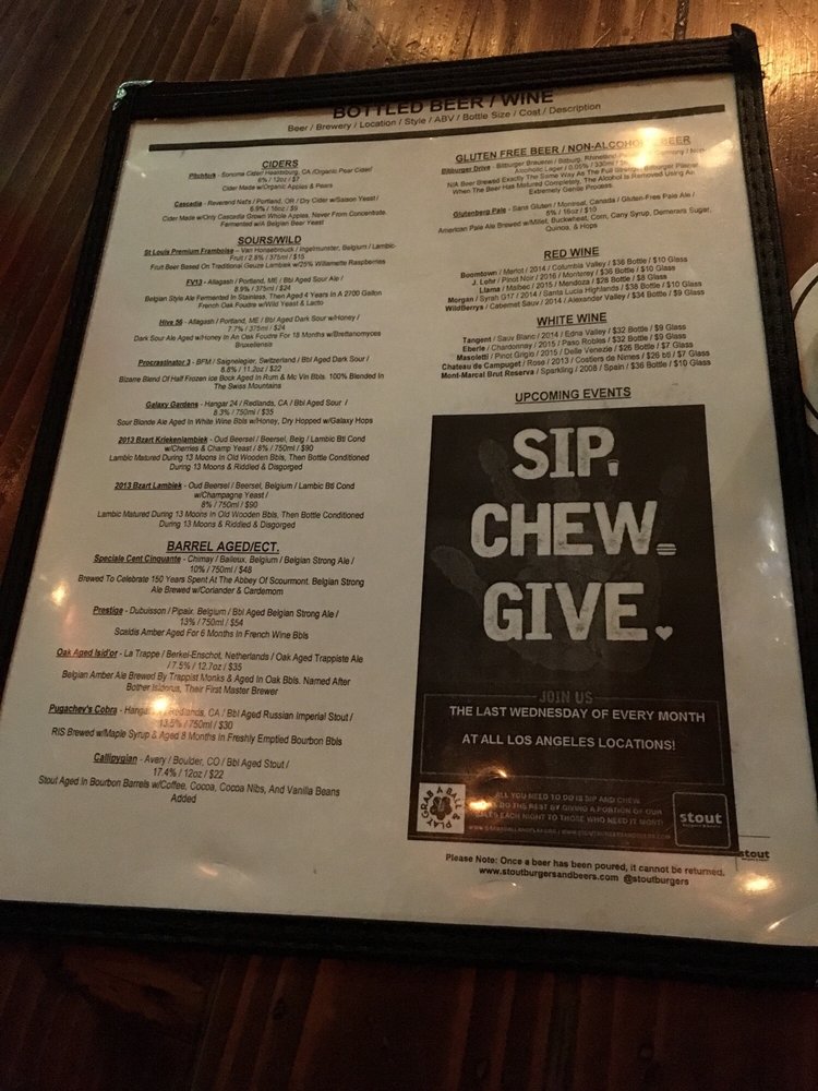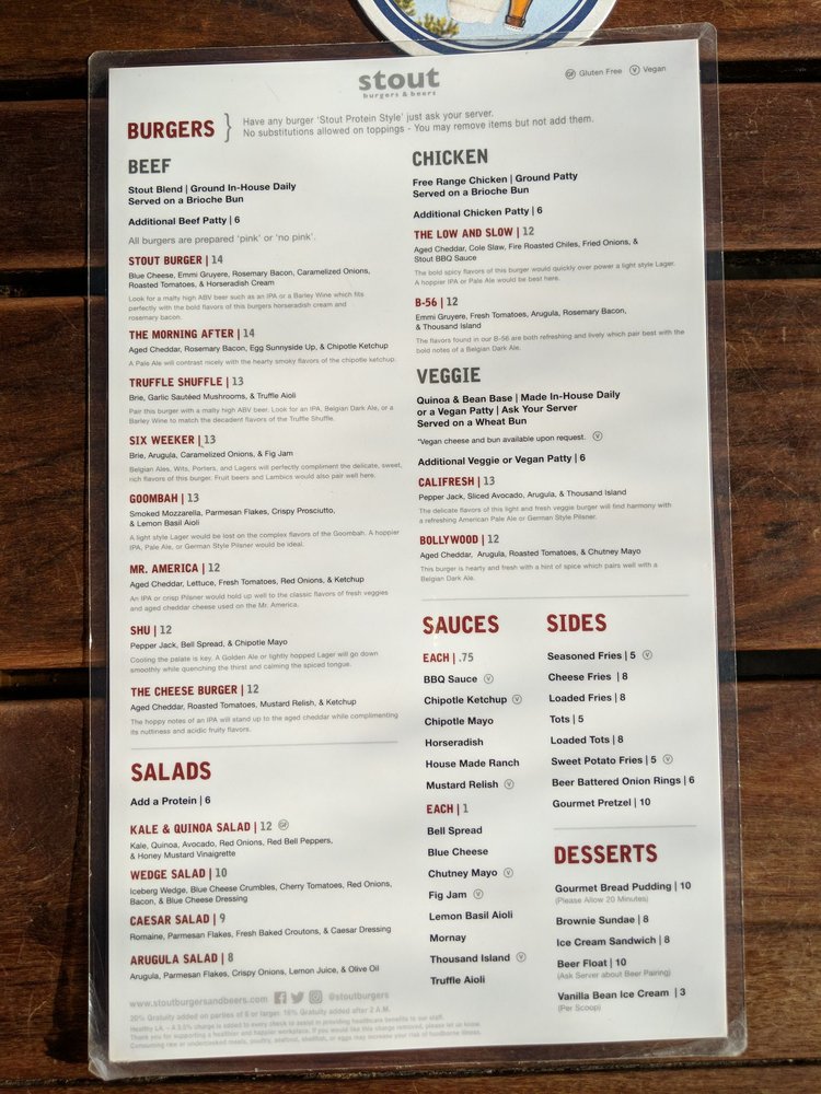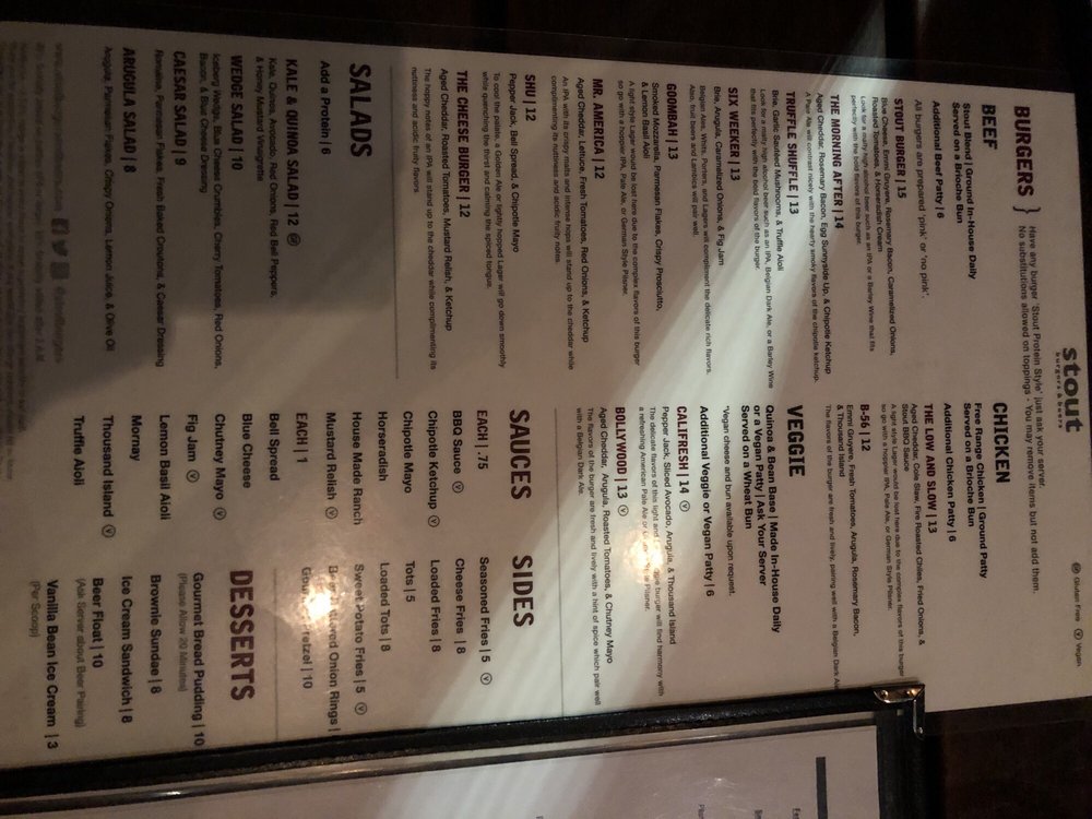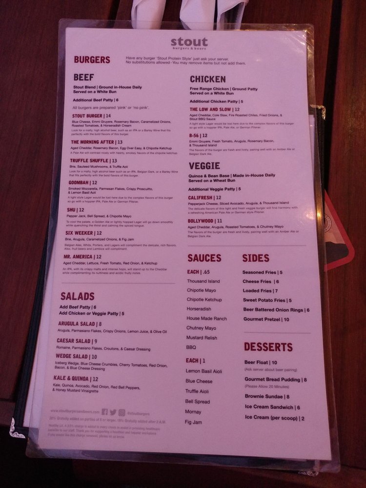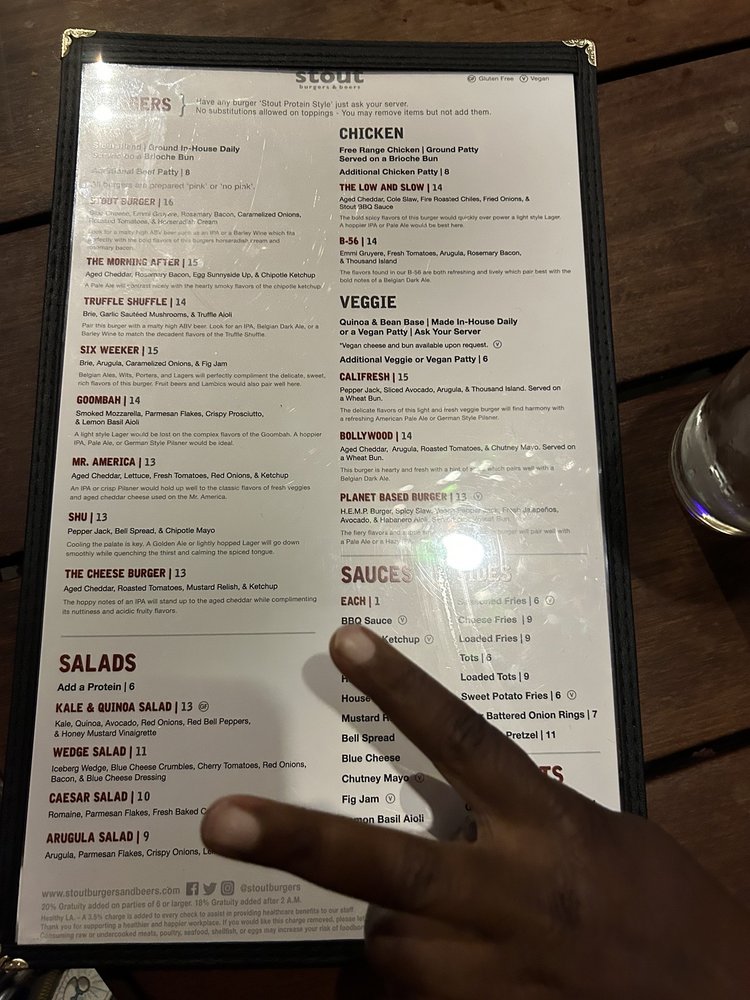 Stout Burgers & Beers, located in Los Angeles, offers a diverse menu with options for beef, chicken, and veggie burgers. Customer reviews rave about the flavorful burgers, like the Truffle Shuffle and the Stout Burger Blue Cheese. The casual and trendy atmosphere makes it a great spot for lunch, dinner, or a late-night bite. The restaurant also provides vegan and vegetarian options, making it inclusive for all diners. Stout Burgers & Beers is known for its attentive staff, great beer selection, and must-try sides like loaded fries and tots. Despite parking challenges, patrons keep returning for the delicious food and welcoming ambiance. Overall, Stout Burgers & Beers stands out for its high-quality burgers and vibrant pub atmosphere.